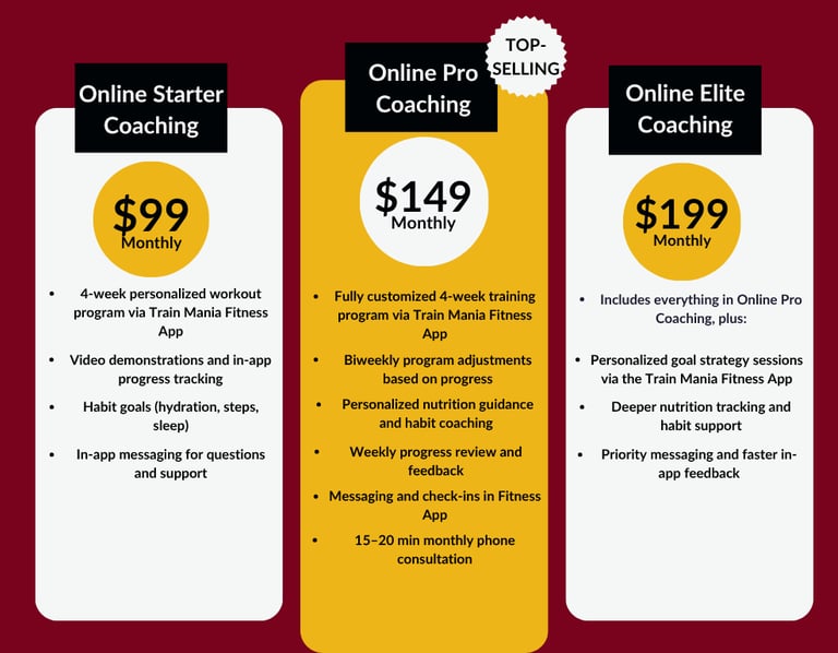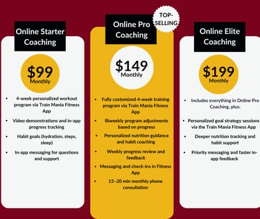 Your fitness journey starts today. Choose your package, join the Train Mania Fitness online community, and start achieving your goals with professional guidance every step of the way.